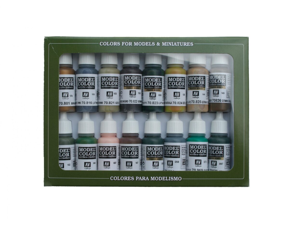 Collection of 16 color sets of Model Color for painting models and miniatures. Each one of these sets has a selection of special colors for painting vehicles, figures, etc.