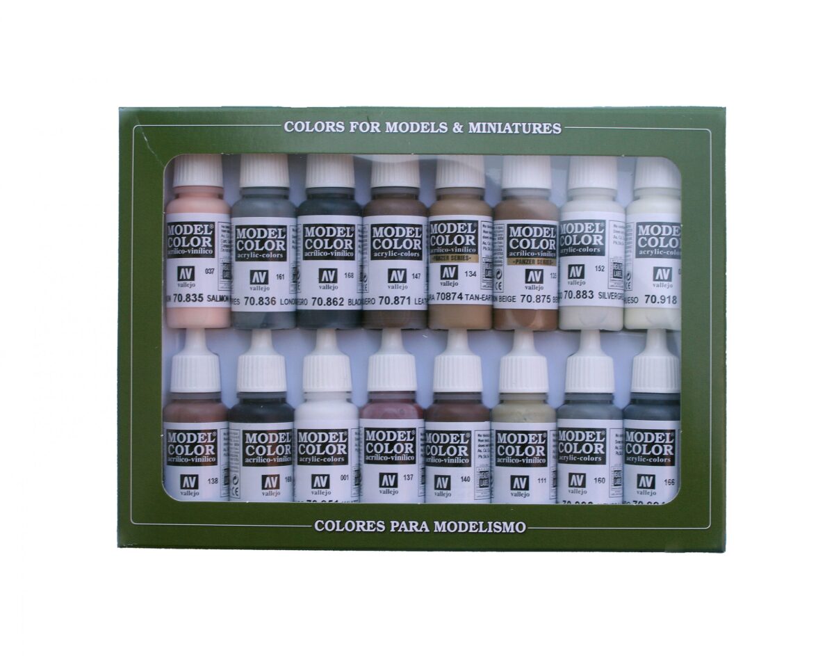 Collection of 16 color sets of Model Color for painting models and miniatures, each one of these sets has a selection of special colors for painting vehicles, figures, etc., contains 16 bottles of 17 ml. with eyedropper and color chart.