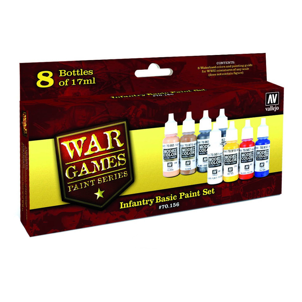 This Infantry Basic Paint Set, when combined with the appropriate nation specific paint set, contains all the colors needed for painting WWII miniatures.