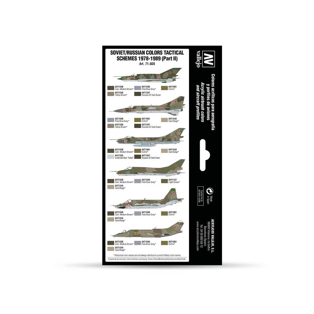Set with Model Air colors developed for painting different models of the Soviet Air Force currently Russian Federation during the last decades of the Cold War and the subsequent collapse of the Eastern Bloc. The set includes profiles of the aircraft and indications of the colors needed, with a detailed description of their application.