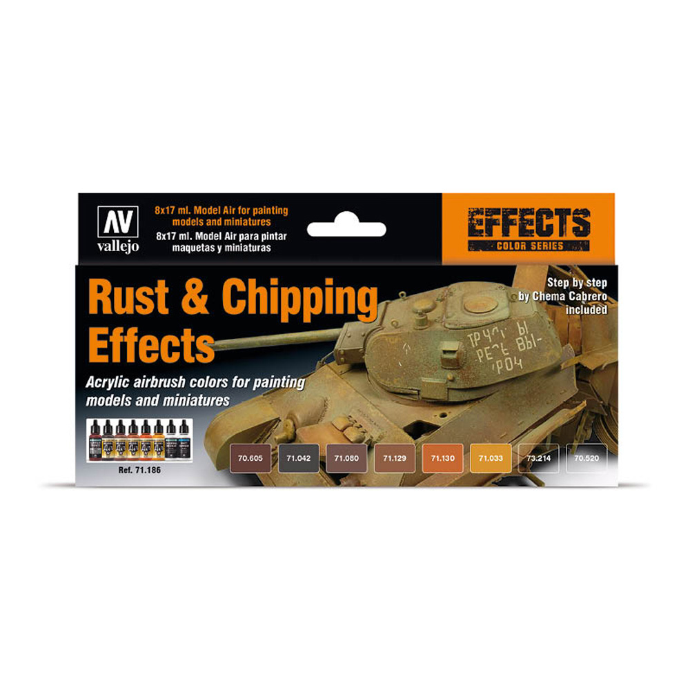 Selection of 8 Model Air colors in 17 ml bottles to create the effects of rust and wear caused by exposure, the step by step photographs made by Chema Cabrero guide the model painter to achieve the final satisfying results.