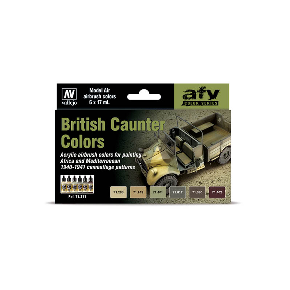 This set contains the colors for the application of the well know British Caunter Camouflage scheme on AFV and vehicles, as well other equipment included in this new ordinance for disruptive camouflage.
