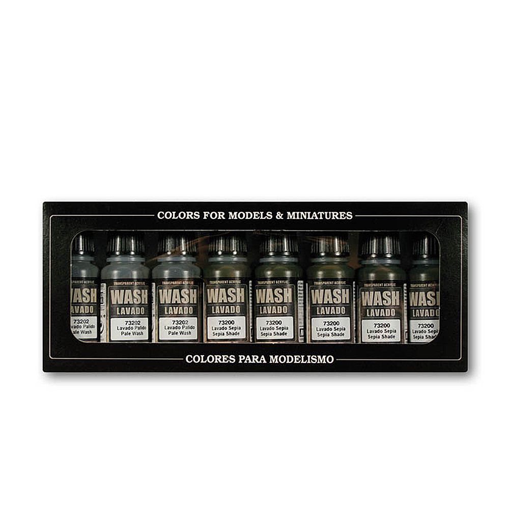 A set of 8 acrylic washes used to enhance details and shading on models and miniatures.